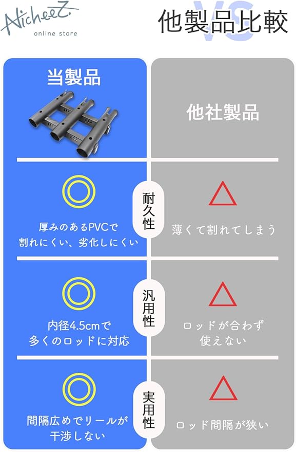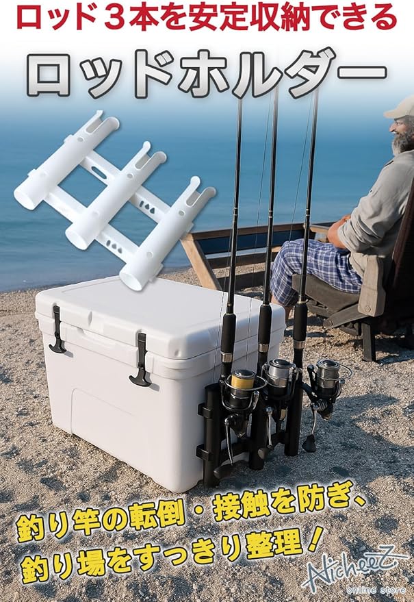 【3連ロッドホルダー】釣りで大活躍の3連ロッドホルダーです。丈夫で壊れにくく劣化もしにくいPVC製。場所を選ばずネジで簡単に取り付けられます。 【さまざまな釣りの現場で】船・ボート・カヌー・カヤックなど本格的なフィッシングの現場で複数のロッド管理にオススメです。 【多機能な収納♪】ロッドホルダーのフレーム部分にはナイフやハサミの収納用の穴や、ルアーフックをかける穴がある、多機能な釣竿スタンドです。 【商品内容】ロッドホルダー(3連) セット数:1個 素材:PVC カラー:ブラック/ホワイト サイズ:全長/約29.8cm 全幅/約32cm ロッドホルダー部内径/4.5cm 【安心の30日保証&オリジナルパッケージ付】本商品は購入から30日間の返品保証付となります。Nicheezオリジナルパッケージに包装し、迅速にお客様の元へお届け致します。商標登録第6600663号