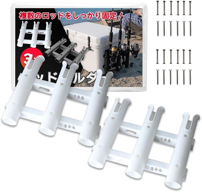 【3連ロッドホルダー】釣りで大活躍の3連ロッドホルダーです。丈夫で壊れにくく劣化もしにくいPVC製。場所を選ばずネジで簡単に取り付けられます。