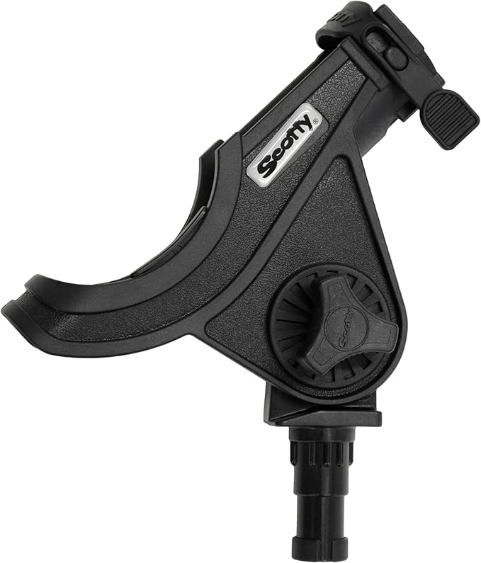 The rod holder design has a side mounted flange, which leaves the bottom open, allowing the rod holder to accommodate trigger grips