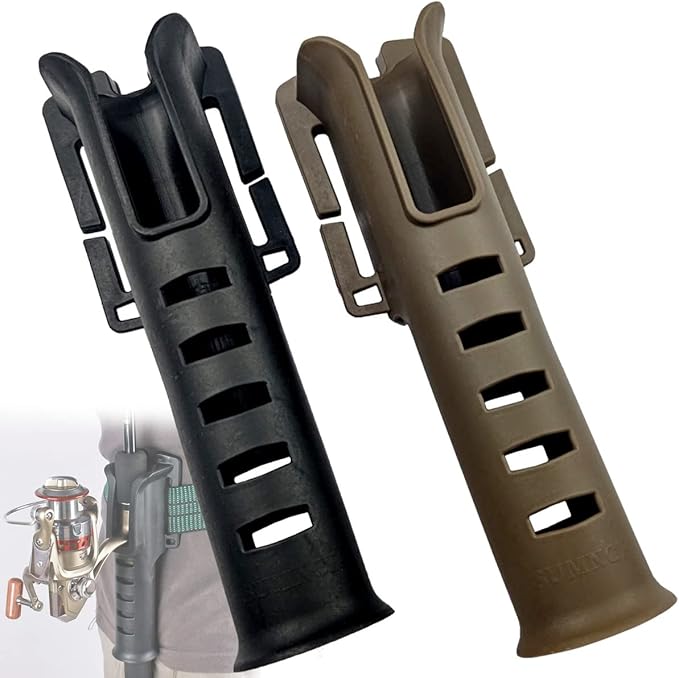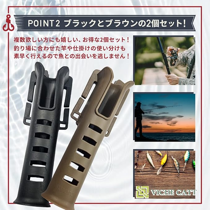 こちらのロッドホルダーは、お手持ちのベルトやフィッシングベストなどに簡単に取り付けることができ、高価なロッドを地面に直置きする事なく、ホルダーに刺したままルアーやフックの交換が行える優れものです。 両手が自由に使えるので荷物が多くなってしまう場面でも大変便利なアイテムとなっております。 ブラックとブラウンの2個セットなので、釣り場に合わせてベルトやベストを使い分けている方にもおすすめです。