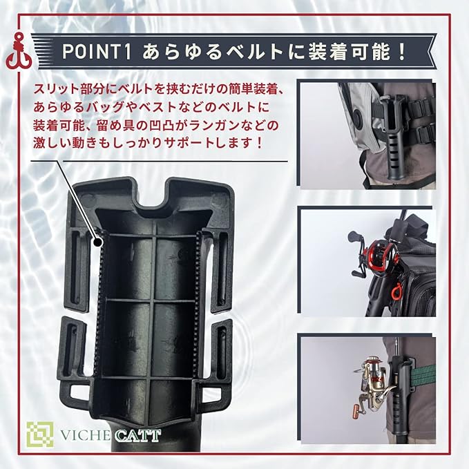 スリット部分にベルトを挟み込むだけの簡単取り付け!さらにベルトをしっかりと掴んでくれる凹凸構造で、重たいロッドや、ランガンなどの激しい動きを要するフィッシングスタイルでもしっかりとサポートしてくれるアイテムです。 さらに幅5.5cmまでであれば、あらゆるバッグやフィッシングベストのベルトなどにも取り付け可能です。