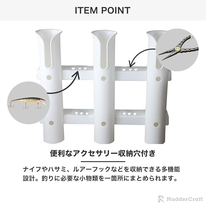 【便利なアクセサリー収納穴付き】ナイフやハサミ、ルアーフックなどを収納できる多機能設計。釣りに必要な小物類を一箇所にまとめられます。