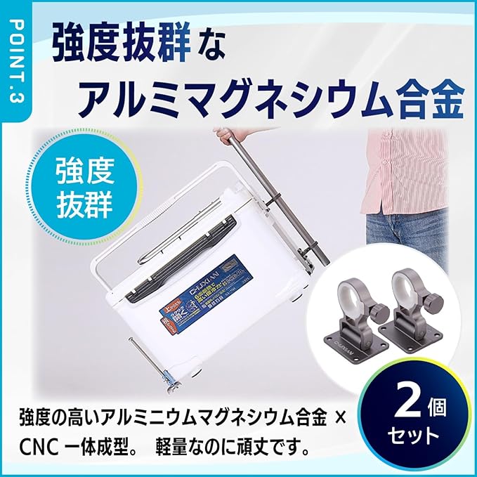 ・軽量アルミロッドホルダー2個セット ・アルマイト処理で耐食性・耐摩耗性アップ ・90℃折りたたみで省スペース ・クーラーボックスにつけて竿立てや傘立てに。竿と箱の接触面積が大きく、風にも強い ・強度抜群のアルミマグネシウム合金製 ・CNC一体成型で耐久性も抜群 ・ロック装置を強化 ・直径20mm-26.5mmの竿にも対応