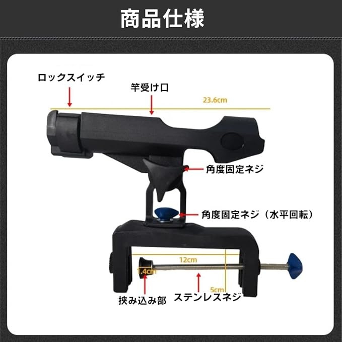 【簡単設営】穴開けの必要はなくネジでクランプを固定するだけのロッドホルダー。しかもクランプ部分が縦・横に切り替えられるので、太さのある岸壁、独特な形状の船べりなど、ホルダーを設置したい場所にABS付きねじを回し、クランプを調整して、しっかりと取り付ければ完成。使いやすいロッドスタンドです。 【安定性】高密度ナイロン製、高強度、頑丈、耐久性があります。耐食性に優れ、耐衝撃性の高いABS構造、サビないので淡水海水での使用に最適な素材。クランプ搭載で不意にロッドが引き込まれても脱落をしっかりと防ぎます。釣り竿を長時間保持することでの疲労を軽減、安定感のある釣竿ホールド、複数使って数本保持も便利です。 【回転自由】360度角度調整可能で、クランプ開口部が大きいので、様々な釣場に適し、縦付け、横付けが切り替え可能なので、お好きな位置に、角度が自由自在に調整できます。釣り中でもロッドの角度調整は便利です。釣り竿の柔軟な角度調整、回転可能なヘッドとなっています。ロッドを傷つけないコート、取り扱いもしやすいスタンドです。 【汎用性】このロッドホルダーは、ほとんどのロッドに適しています。船釣り、筏釣り、ボート釣り、小型船等への設置に適しており、縦横自在、クランプならでは、傷をつけずしっかり固定ができます。軽量で持ち運びも楽々、ボートやいかだに簡単に設置できます。強力なクリップでほとんどのボートやいかだにフィットし、調整可能で便利です。 【仕様】移動時や魚の取込時にロッドを差し込むだけ。慌てることなく簡単にロッドが立てられ、竿から手を離したい時、安心にルアーなどを準備したり、休憩したりできます。素材: ナイロン 金属。ロットにより微細な擦傷がある場合がございます。モニター環境等により色の見え方に若干差がある場合がございます。