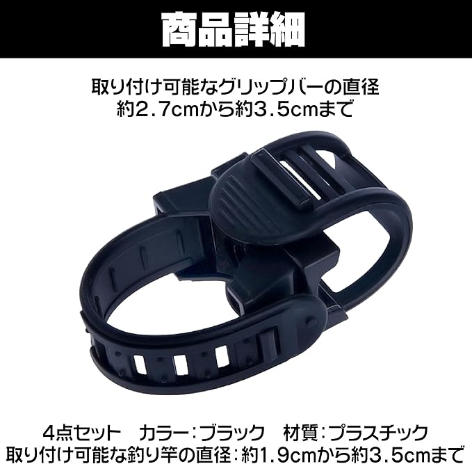 セット内容:4点セット カラー:ブラック 材質:プラスチック 取り付け可能なグリップバーの直径:約2.7cmから約3.5cmまで 取り付け可能な釣り竿の直径:約1.9cmから約3.5cmまで ※モニターの環境等により、色の見え方に若干差が生じる場合がございます。