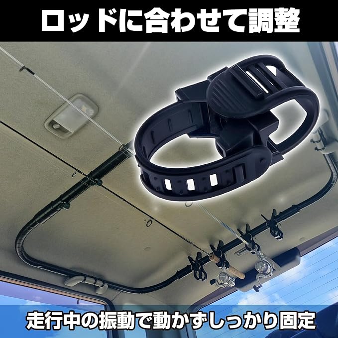 車内の天井のグリップバーに取り付け可能:車内の天井に設置したマルチグリップバーなどに取り付けて、釣り竿を固定できるロッドクリップです。固定したいものに合わせて、位置を調整して取り付けできます。