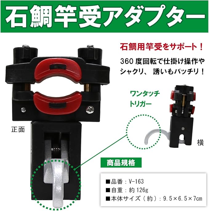 タカ産業V-163 石鯛竿受アダプター!!石鯛用竿受をサポート!360度回転で仕掛け操作やシャクリ、誘いもバッチリ!ワンタッチトリガ-!レバーを引けばワンタッチで着脱できます!取り外し簡単!