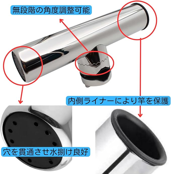 材質は高級感のあるステンレス製。鏡面研磨仕上げ、耐食性・耐久性に優れています。パイプ内にはライナーがあり、竿を傷つけず底面は水捌けを良くするために穴が空いています。 また、釣り竿ホルダーはもちろん、釣り竿ホルダーや釣り竿ストッパーとしても活躍します。釣り竿ホルダーの他にも、釣りポールホルダーや船ロッドホルダー、竿置きにも利用可能な設計です。