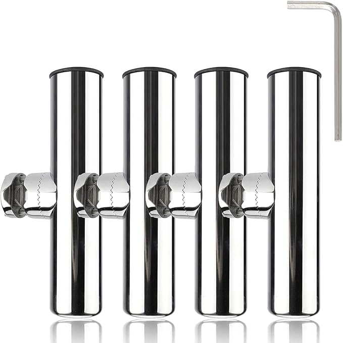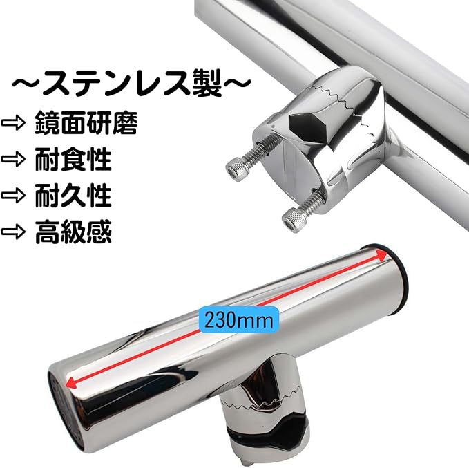 ステンレス製。クランプオン式のセットロッドホルダー。釣り愛好者のための理想的なアクセサリーです。このステンレス製のロッドホルダーは、船竿置きに最適なアイテムで、クランプオン方式で一般的な船に使用されている19mm-25mmのパイプに取り付けられ、安定感抜群です。