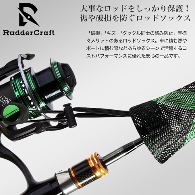 【大事なロッドをしっかり保護!傷や破損を防ぐロッドソックス】 「破損」「キズ」「タックル同士の絡み防止」等様々メリットのあるロッドソックス。車に積む際やボートに積む際などあらゆるシーンで活躍するコストパフォーマンスに優れた安心の一品です。