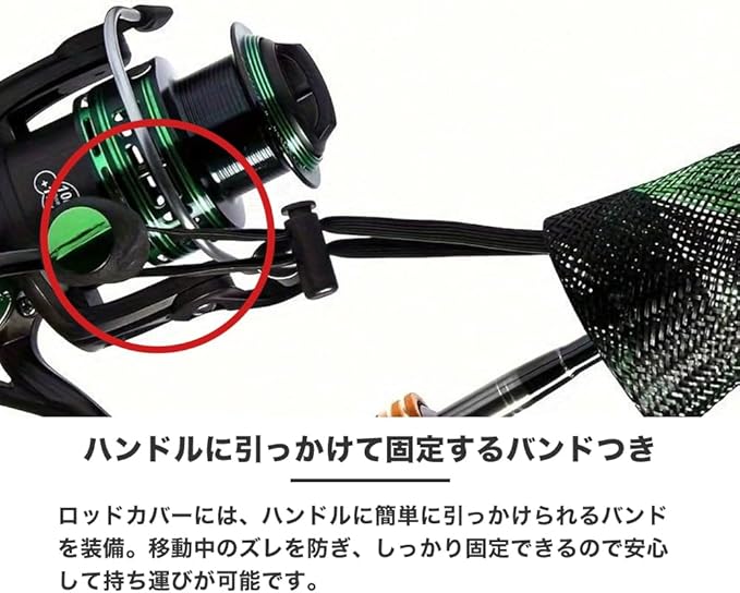 【ハンドルに引っかけて固定するバンドつき】 ロッドカバーには、ハンドルに簡単に引っかけられるバンドを装備。移動中のズレを防ぎ、しっかり固定できるので安心して持ち運びが可能です。