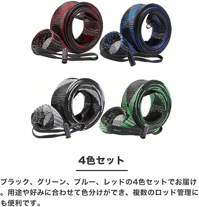 【4色セット】 グレー、グリーン、ブルー、レッドの4色セットでお届け。用途や好みに合わせて色分けができ、複数のロッド管理にも便利です。