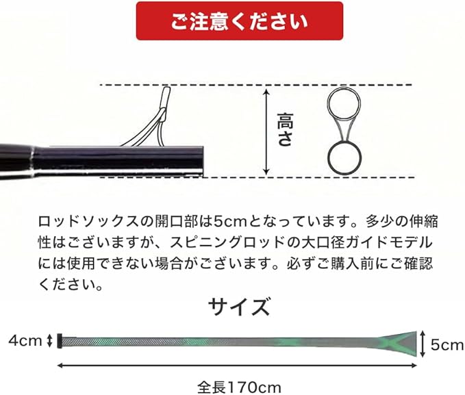 【ご注意ください】 ロッドソックスの開口部は5cmとなっています。伸縮性はございますが、スピニングロッドの大口径ガイドモデルには使用できない場合がございます。必ずご購入前にご確認ください。