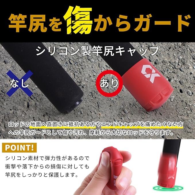 【竿尻を傷からガード】ロッドの地面へ直置きに抵抗ある方やエンドキャップを痛めたくない方への竿尻保護、竿尻ガードとして傷や汚れ、摩耗から大切なロッドを守ります。シリコン素材で弾力性があるので衝撃や落下からの損傷に対しても竿尻をしっかりと保護します。竿尻や持ち手への汚れや水の浸入を防ぎ、ロッドの寿命を延ばしてくれます。