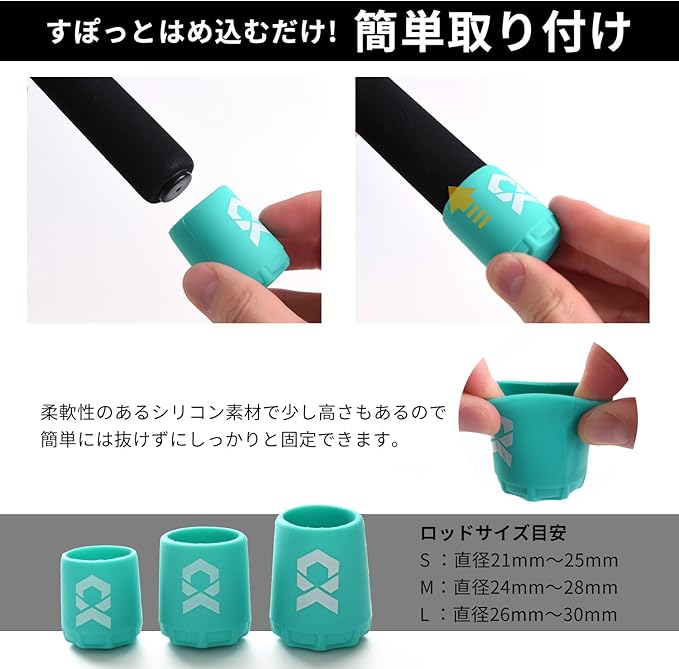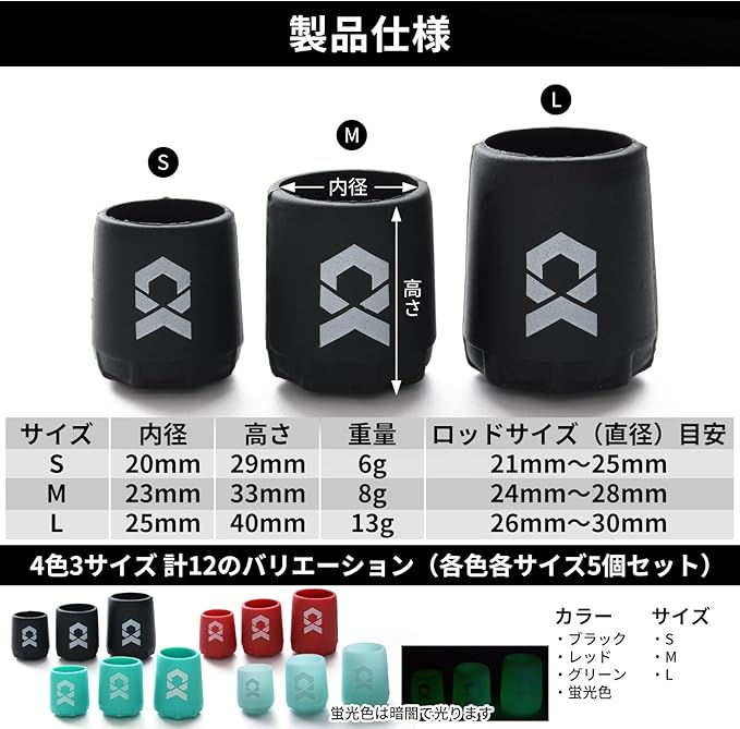 【製品仕様】サイズ S M L カラー4色ブラック・レッド・グリーン・蛍光色 :S内径2cm高さ2.9cm重量6g(ロッドサイズ目安 21mm-25mm): M内径2.3cm高さ3.3cm重量8g(ロッドサイズ目安直径24mm~28mm): L内径2.5cm高さ4.0cm重量13g(ロッドサイズ目安直径26mm~30mm)
