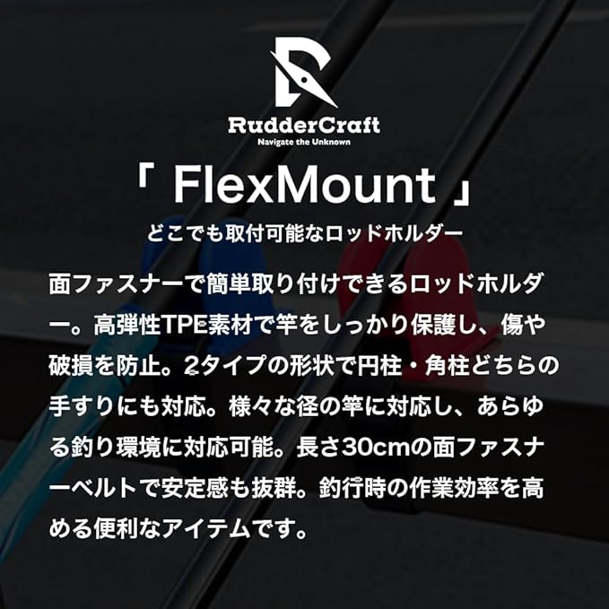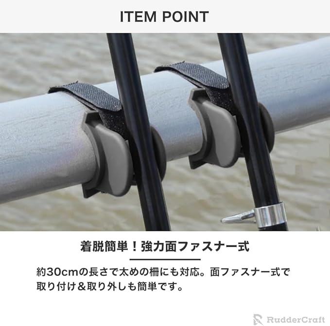 面ファスナーで簡単取り付けできるロッドホルダー。高弾性TPE素材で竿をしっかり保護し、傷や破損を防止。2タイプの形状で円柱・角柱どちらの手すりにも対応。様々な径の竿に対応し、あらゆる釣り環境に対応可能。長さ30cmの面ファスナーベルトで安定感も抜群。釣行時の作業効率を高める便利なアイテムです。
