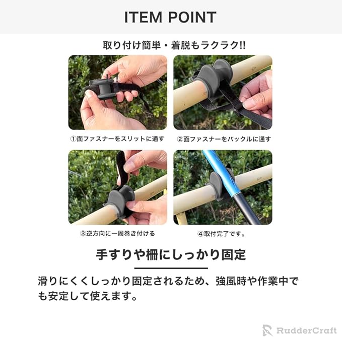 【手すりや柵にしっかり固定】滑りにくくしっかり固定されるため、強風時や作業中でも安定して使えます。