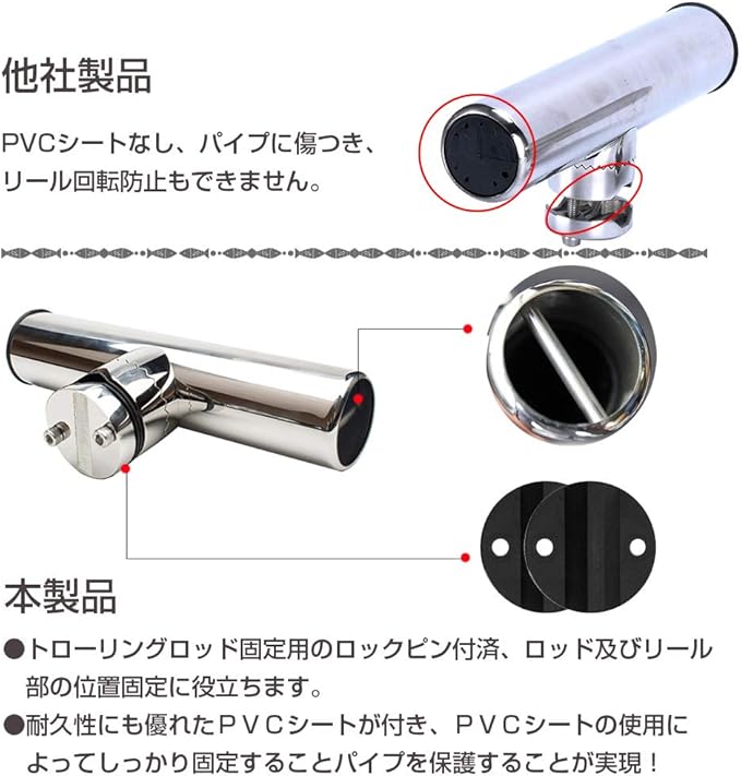 当社 ステンレス ロッドホルダー はPVCシートを増加、パイプに傷つかない一方で装着の安定性も増加、そして ステンレス ロッドホルダー の底側にトローリングロード回転を防止用のピンが取り付け済み、ロードとリールの回転が有効に防止でき。ピン仕様だからこそ、水が溜まりません。(ロッドホルダー 船)
