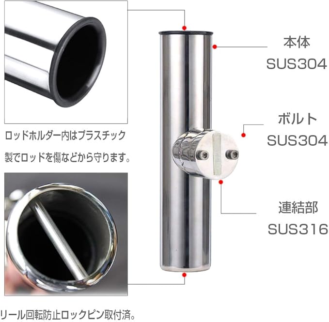 ステンレス ロッドホルダー のホルダー部分材質:SUS304、クランプ部分材質:SUS306で、耐腐蝕性と高級感兼備。ホルダー内部にはプラスチック製で、ロードに傷つきません。(ロッドホルダー 船)
