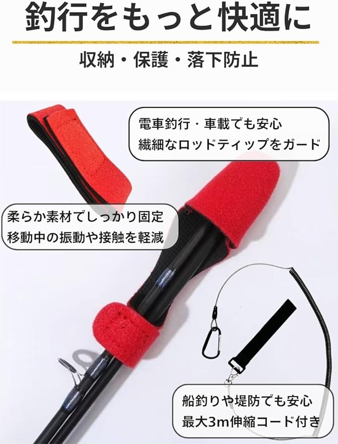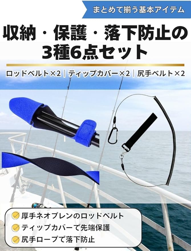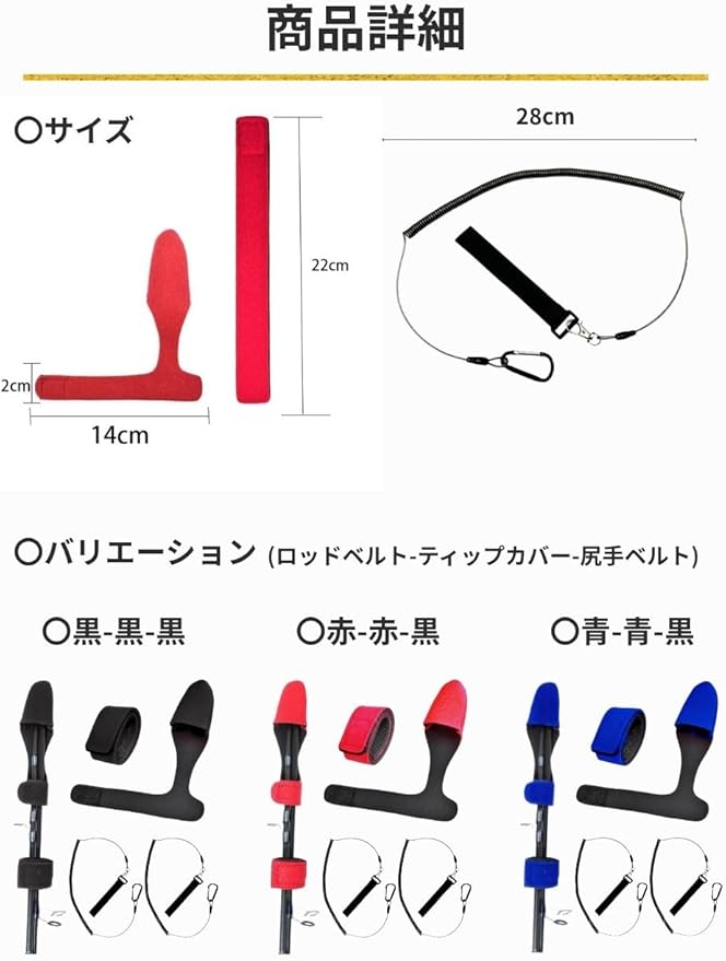 【商品仕様】〇セット内容:ロッドベルト 2本、ティップカバー 2個、尻手ベルト 2本の6本セット。〇カラー:ロッドベルト→ブラック、レッド、ブルー。ティップベルト→ブラック、レッド、ブルー。尻手ベルト→ブラック。〇仕様:ロッドベルト→長さ:約22cm。幅:2.5cm。重さ:約12g。ティップカバー→長さ:約14cm。ベルト幅:約2cm。重さ:約13g。尻手ベルト→長さ:通常時約28cm。最大長約3m。重さ:約26g。〇素材:ロッドベルト、ティップカバー(ネオプレン)、尻手ベルト(ロープ→TPU、ベルト→ポリプロピレン、フック→亜鉛合金・アルミニウム合金)。※サイズにつきましてはあくまで目安のため若干の誤差が生じる場合がありますのでご了承下さい。※商品写真はできる限り実物と近づけるようにしていますが、お使いのモニター設定、お部屋の照明等により実際の商品と色味が異なる場合があります。※海外製品のため日本製のものと比べて細かいところで雑に見えるものや多少の誤差がある場合があります。恐れ入りますが予めご了承ください。