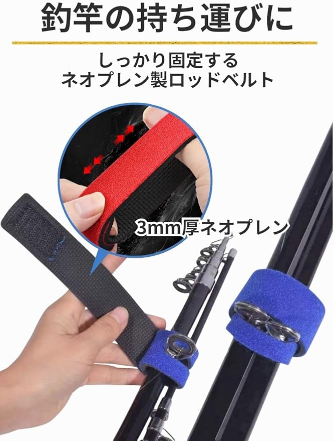 【ロッドベルト:移動・収納時の振動防止に】ネオプレン素材を使用した釣竿ベルトは、2ピースロッドや複数本のバンド留めに適した仕様です。柔軟性と耐久性を兼ね備えた3mm厚の生地で、大切なロッド同士がぶつかるのを防ぎます。表面はマジックテープ式になっており、しっかり固定しながらも着脱もスムーズです。ショア用、磯用、バスロッド、ライトゲームロッドなど様々な太さに対応し、保管時や車載時にも便利です。