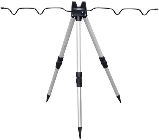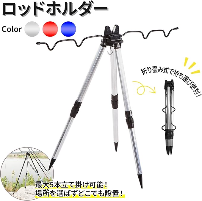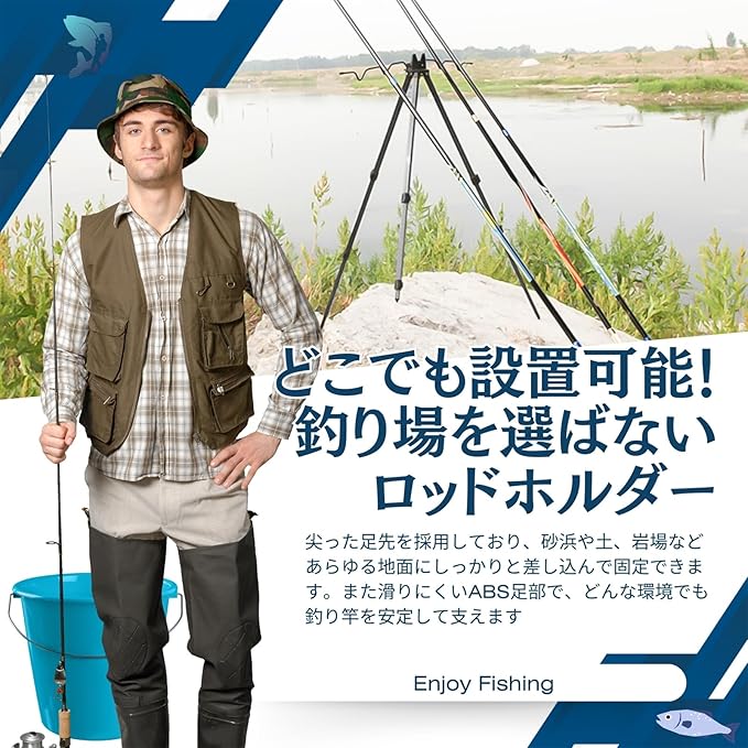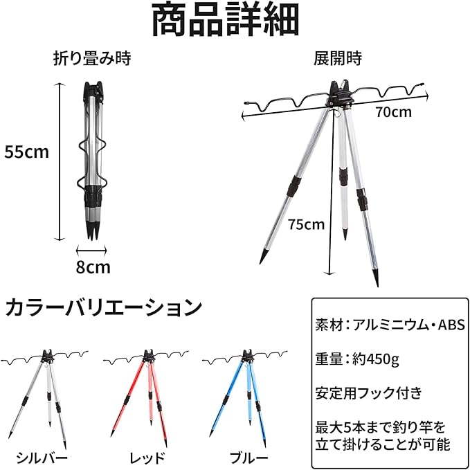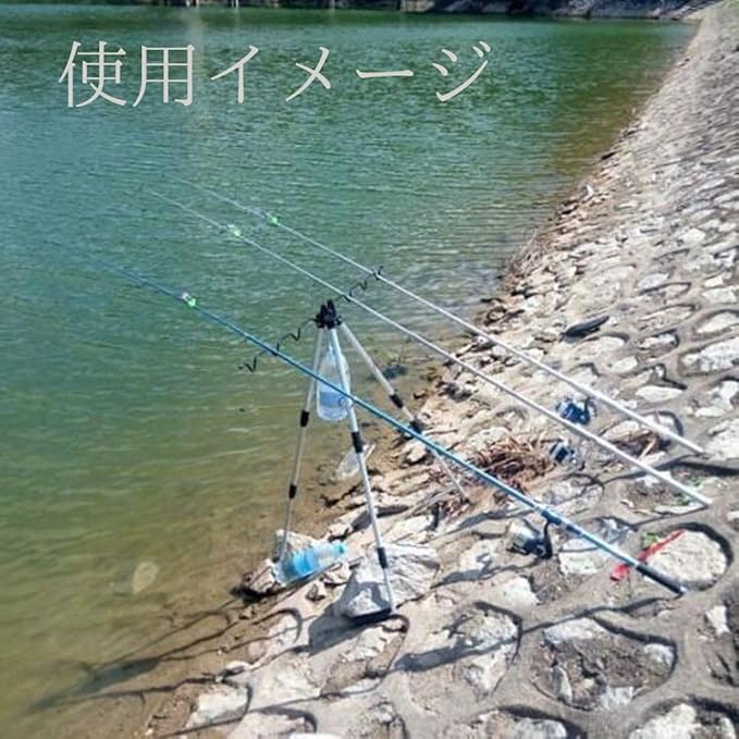 【しっかり固定】脚の長さはネジ式でしっかり固定することができ、竿立ての中心部にフックがついているので、重いものをかけて安定することができ、バケツや小物をひっかけることもできます。