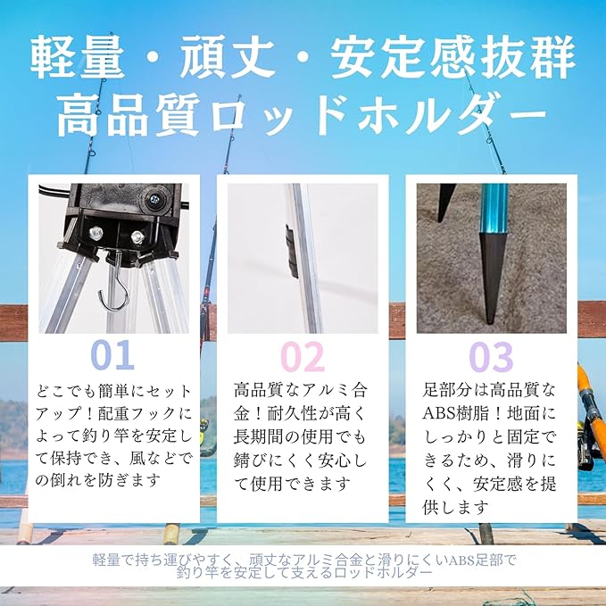 【しっかり固定】脚の長さはネジ式でしっかり固定することができ、竿立ての中心部にフックがついているので、重いものをかけて安定することができ、バケツや小物をひっかけることもできます。"