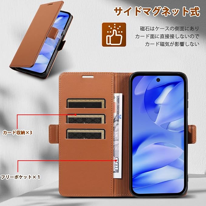 4.【カードポケット付き】Google Pixel 9a 対応のスマホケース。背面にカードポケット3箇所と紙幣用ポケット1箇所を装備し、財布代わりとしてもご利用いただけます。収納機能:✅ 交通系ICカード(SUICA/PASMO)、✅ クレジットカード・ポイントカード、✅ 名刺・定期券・運転免許証、✅ メモ用紙・小銭(サイドポケット)。利便性:・薄型設計でポケット収納に最適、・ビジネスから日常使いまで多用途対応、・通勤/買い物など短時間の外出に便利。※ 側面には現金も少し収納することができます。