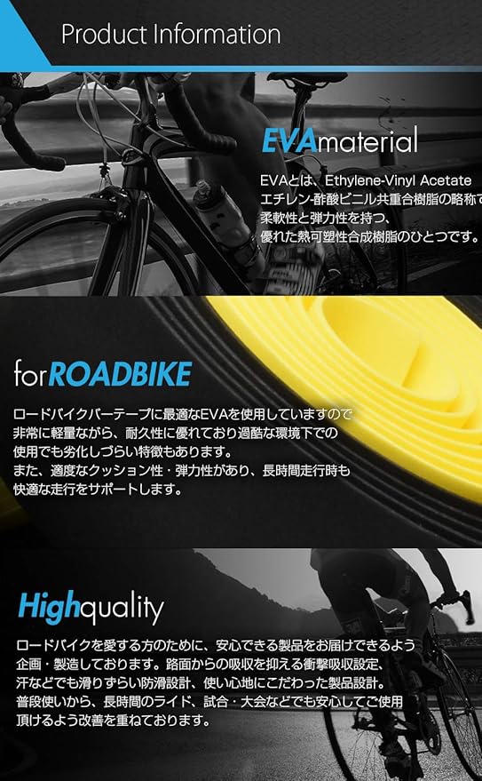 バーテープに最適なEVAを使用、軽量、耐久性に優れており過酷な環境下での使用でも劣化しづらい特徴もあります。適度なクッション性・弾力性があり、長時間走行時も快適な走行をサポートします。