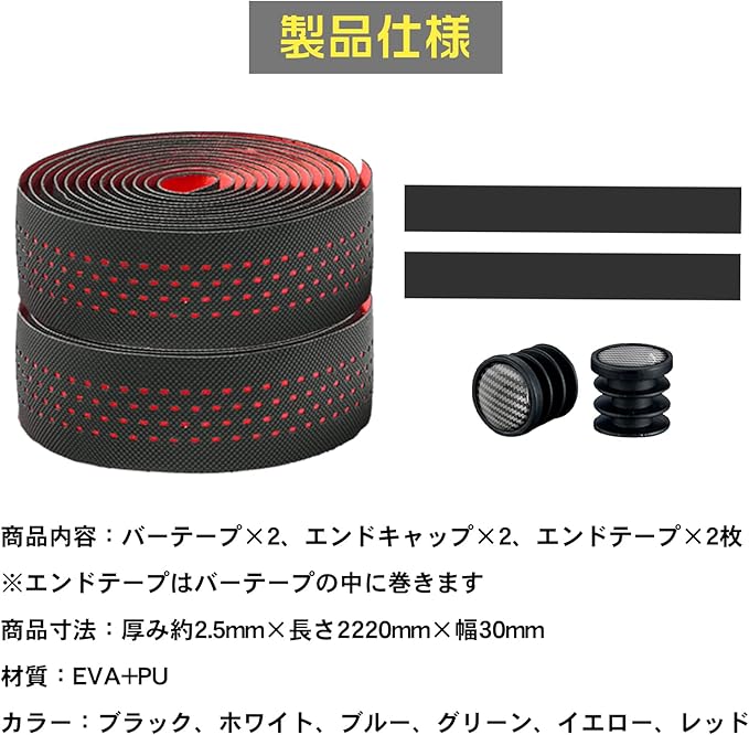 【取り付け簡単】 汎用性の高いデザインなので、幅広く自転車のハンドルに適用します。 エンドキャップ、エンドテープも付属していますので、工具が不要で先端と末端の処理を簡単にできます。※取り付け方法:①ハンドルを清掃します。②ハンドルの両端から包みながら、すごし張力を維持します。③張力を調整しながらハンドルを包みます。④付属のエンドテープで固定して、両端にエンドキャップを取り付けて完成です。