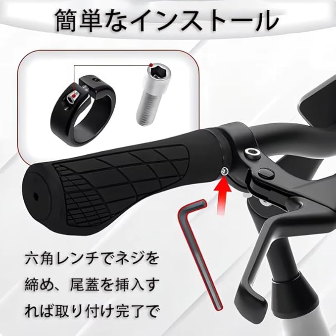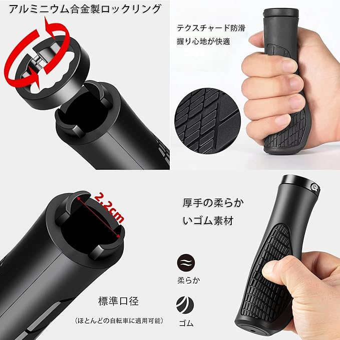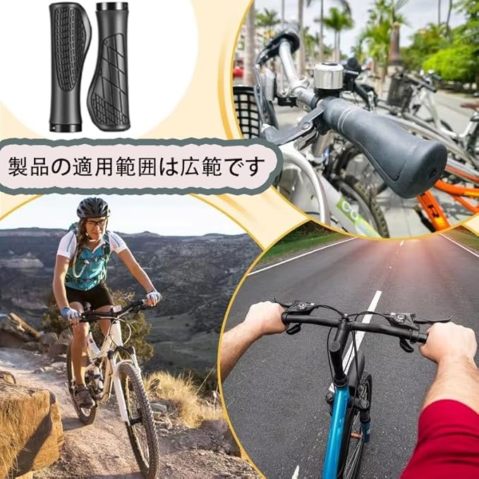 を含むほとんどの自転車モデルに適合します。耐久性に優れたゴム素材とアルミ合金のインナーリングを採用しており、滑り止め効果と優れた耐衝撃性を備えています。 人間工学に基づいたエルゴグリップ設計で、長時間のライディングでも手の疲労を軽減します。表面には滑り止めの凸状ゴム粒子が配置されており、路面の振動や衝撃から手を保護します。また、変形しにくい素材を使用しているため、長期間の使用でも形状を維持します。 取り付けは簡単で、付属の六角スパナを使用して自転車のハンドルに固定するだけです。折りたたみ自転車やシクロクロス自転車など、様々なタイプの自転車に使用可能です。ブラックカラーのシンプルなデザインは、どんな自転車のハンドルにもマッチします。 この自転車グリップは、快適性と安全性を求めるライダーに最適な自転車パーツです。クロスバイクグリップやマウンテンバイクグリップとして、また日常使いの自転車ハンドルグリップとしておすすめです。