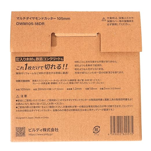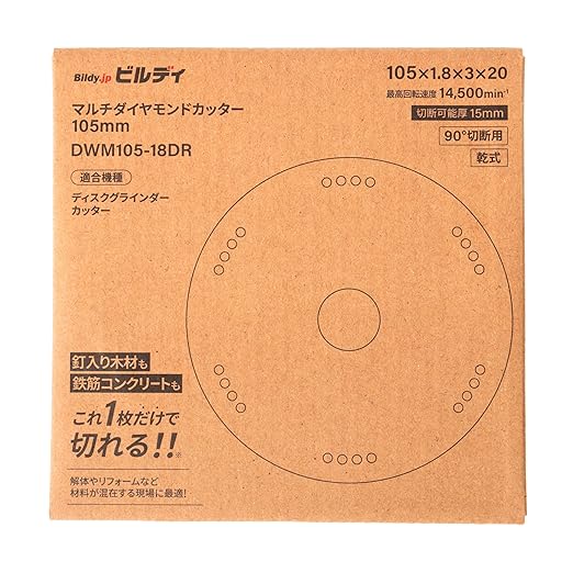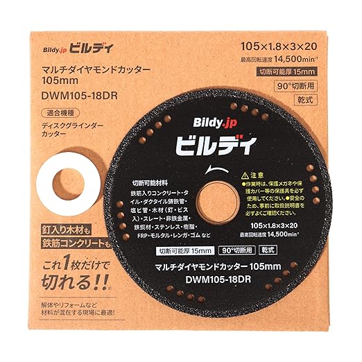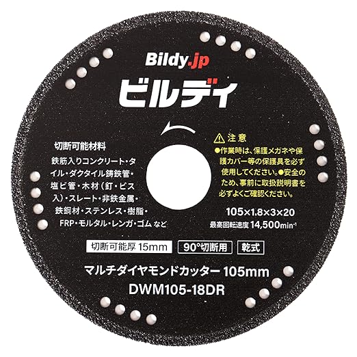 【品番】DWM105-18DR 【外径】105mm 【内径】20mm(付属リング15mm) 【刃厚】1.8mm 【刃幅】3mm( 0.5mm) 【最高回転速度】14,500min-1 【切断可能厚】15mm 【切断角度】90 切断用 【切断方法】乾式 【切断可能材料】鉄筋入りコンクリート、タイル、ダクタイル鋳鉄管、塩ビ管、木 (釘・ビス入り)、スレート、非鉄金属、鉄鋼材、ステンレス、樹脂、FRP、モルタル、レンガ、ゴムなど 【適合機種】ディスクグラインダー、カッター