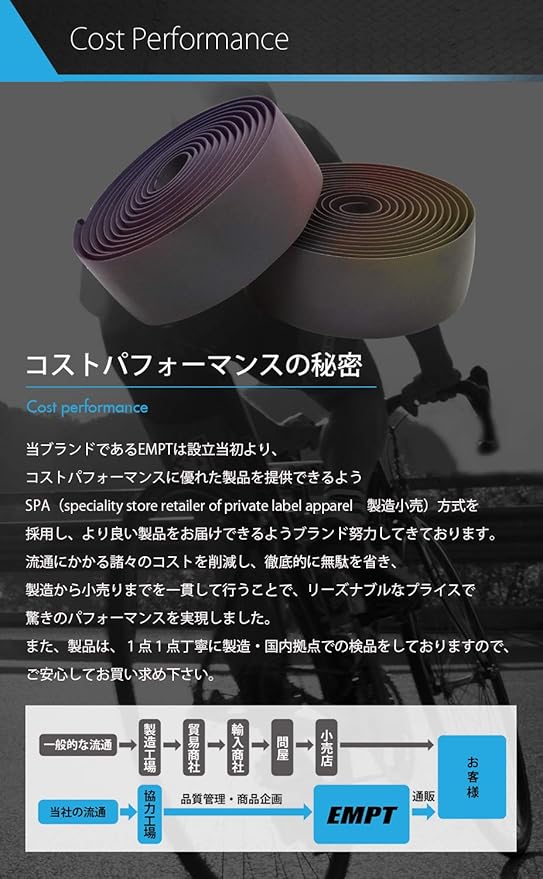 累計販売本数92,000本突破!非常に多くのサイクリストの方にご愛用頂いています。種類豊富で様々なデザインで好みのバーテープが見つかる!EMPT ロードバイク用ハンドルバーテープ バーテープに最適なEVAを使用、軽量、耐久性に優れており過酷な環境下での使用でも劣化しづらい特徴もあります。適度なクッション性・弾力性があり、長時間走行時も快適な走行をサポートします。 SPA方式を採用し流通にかかるコストを削減し、リーズナブルなプライスで驚きのパフォーマンスを実現しました。1点1点丁寧に製造・国内拠点での検品をしておりますので、ご安心してお買い求め下さい。 バーテープ交換が初めての人も安心!便利で分かりやすい日本語図解(イラスト付き)説明書が付属します。初めての方でも迷わずに巻けたと高評を頂いていますので、ご安心下さい。 30日間安心品質満足保証付 豊富なバリエーション、カラーの中からお好みのバーテープをお選び下さい。サイクリストの方のご要望に沿えるよう、新商品、新カラーを拡充して参ります。