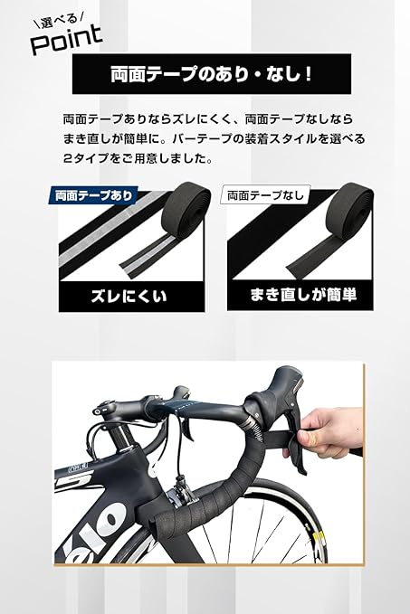 【両面テープあり・なしが選べる!】 両面テープありならズレにくく、両面テープなしならまき直しが簡単に。バーテープの装着スタイルを選べる2タイプをご用意しました。