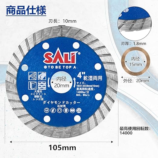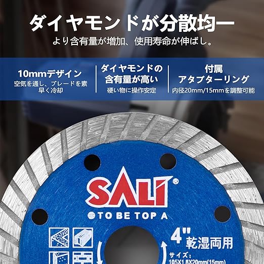 SALI ダイヤモンドカッター リムタイプ ターボ 高速 薄刃 2枚セット コンクリートカッター 石材カッター 105mm ターボ切断 ダイヤモンドブレード 乾式 湿式 タイル セラミック 花崗岩 切断ブレード | KAZESHOP