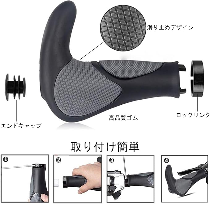 【製品仕様】材質:TPRゴム+アルミニウム合金。サイズ:14x6.5cm。重量:約190g(2個)。適合ハンドルの内径:22.2mm。セット内容:自転車ハンドルグリップ*2、エンドキャップ*2、六角レンチ。
