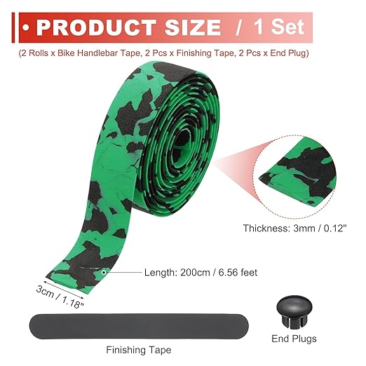 仕様:カラー:黒-緑;素材:EVA;長さ:200cm / 6.56フィート;幅:3cm / 1.18";厚さ:3 mm / 0.12";梱包リスト:自転車ハンドルバーテープ2巻、仕上げテープ2個、エンドプラグ2個