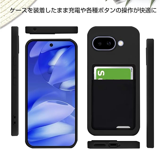 【 薄型軽量 】スマホの機種pixel9aに適合するケース。厚さわずか1.2mm、重さ40gと軽く、装着も簡単なため、他の重いケースと比較してもただでさえ重いスマホの使用に拍車をかけることはありません。【驚きの触り心地】ケースには油や汚れに強く、手触りも心地よいリキッドシリコンを採用しました。日常的にストラップを使用したいお客様向けに、ストラップ穴を実装しております。【カードホルダー】リキッドシリコン製のカード入れを採用し、心地よい手触りを実現しました。磁石を使用していないため、カードを取り出さなくても地下鉄の乗り換え等のカードタッチが楽々可能です。カードを取り出すときは、右下の穴を押してカードを一部持ち上げれば取り出すことができ、とても便利です。銀行カード以外にも、名刺なども楽々入れていただけます。【ピッタリデザイン】ホールの位置が正確なため、スピーカー、カメラ、オン/オフボタン、ボリュームキーがすべてケースにぴったりと収まり、ケースをつけたままでもスムーズな操作が可能です。