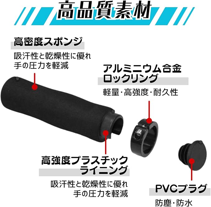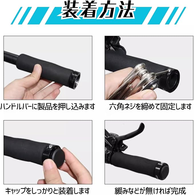 エンドキャップ付きで、見た目もスッキリ。ハンドルバーの保護にも役立ちます。また、取り付けは差し込むだけの簡単な仕様で、手軽に交換できるので、自転車初心者の方でも安心してカスタムを楽しめます。