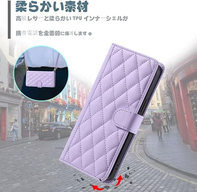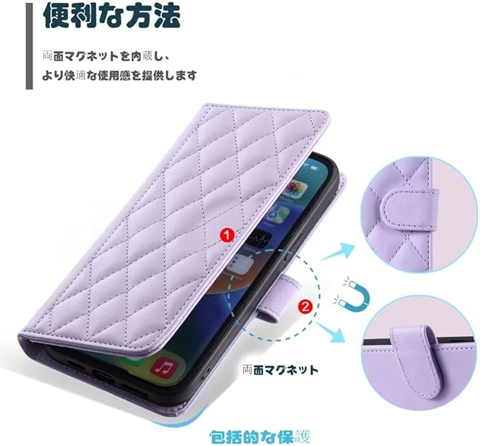 【高品質素材及び設計】大切なスマホを守る安心の手帳型。内部は衝撃吸収性に優れたTPU素材を採用して、落下時の衝撃を効率よく吸収するようにケース の各コーナー内側が設計されています。手触りが良く、キルティングの設計は控えめでエレガントです。