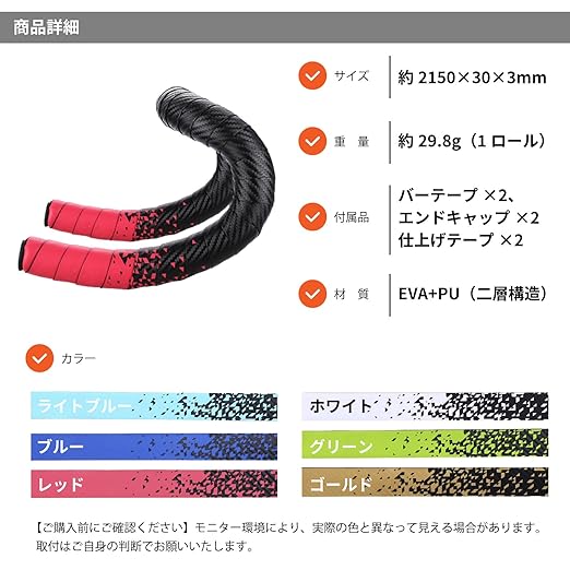 【仕様】材質:EVA+PU 二層構造 / サイズ:約2150 30 3mm / 重量:約29.8g(1ロール) / 付属品:バーテープ 2、エンドキャップ 2、仕上げテープ 2 ※ご使用のモニター環境により色味が異なる場合があります。 ※取付はご自身の判断でお願いいたします。