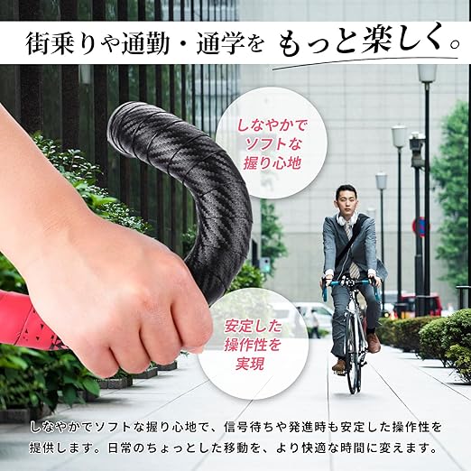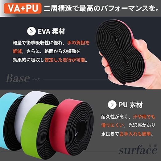 ロードバイクやクロスバイクに欠かせないバーテープ。EVA+PUの二層構造を採用し、握りやすさとソフトなクッション性を実現しました。長時間のライドでも手の疲れを軽減し、快適な走行をサポートします。