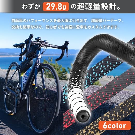 重量は1ロールあたりわずか29.8gと軽量で、自転車のパフォーマンスを損なうことなく装着可能。交換も簡単で初心者でも安心して取り付けられ、カラー展開も豊富なため、自転車に合わせて自由にカスタムできます。