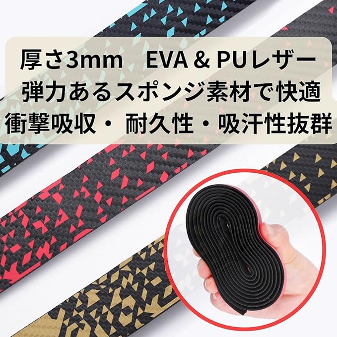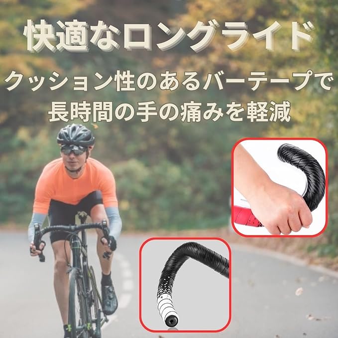✅【高品質素材で優れた触感とグリップ力】素材: EVAとPUレザーの2層構造 特徴: 軽量でありながら伸縮性があり、表面には滑り止め加工が施されているため、優れた触感とコントロール性を提供します。雨や濡れた環境でも安定したグリップを実現し、滑りにくく安全です。 ✅【優れた衝撃吸収性で長時間ライドも快適】衝撃吸収: EVAとPUレザーの2層構造により、地面からの衝撃を効果的に吸収。手のひらへの負担を軽減し、長時間のライドでも疲れにくくなります。 ✅【簡単取り付けと美しい仕上がり】取り付け: 裏面が台形カットになっているため、きれいに巻きやすく、自然と表面がフラットに仕上がります。エンドキャップも付属しており、末端の処理も簡単です。 ✅【幅広い用途で多機能なバーテープ】適用範囲: 一般の自転車、ロードバイク、マウンテンバイクだけでなく、ベビーカーや釣り竿、スポーツラケットなどにも使用可能。6色から選べるので、お好みに合わせてカスタマイズできます。 ✅【製品内容】バーテープ 2本/エンドキャップ 2個/エンドテープ 2枚 【寸法】長さ: 2150mm/幅: 30mm/厚み: 3mm/重量: 30g※取扱説明書は付属いたしません。