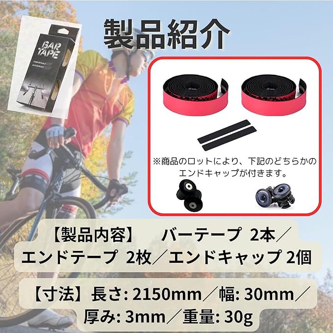 ✅【カラー】レッド【製品内容】バーテープ 2本/エンドキャップ 2個/エンドテープ 2枚【寸法】長さ: 2150mm/幅: 30mm/厚み: 3mm/重量: 30g※取扱説明書は付属いたしません。