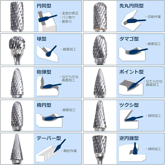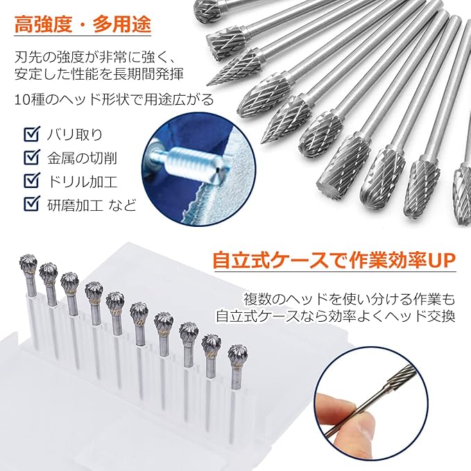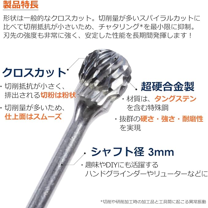 <材質>: タングステン鋼 球型10本セット ケース付 <サイズ>: 全長 約41mm <シャンク径>(固定部): 3mm <用途>: 切削・研磨加工 <適合材質>: 炭素鋼、合金鋼、耐熱鋼、ステンレス、鋳鉄、チタン合金、溶接鋼等 <使用方法>: リュータードリル、専用のハンドグラインダー(エアーグラインダー)など回転ツールに取り付けし、使用ください。 <特長>: 長寿命で、切削研磨の必需品です。 精度の高い研磨が可能で、均一な仕上げが可能です。