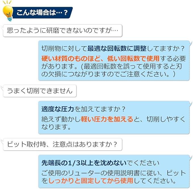 超硬ドリルの主な特長として、エアや電気を原動力とするグラインダー(回転工具)の先端に取り付けて使用します。 刃径により推奨回転数で使用し、必要以上に強く押し当てないことが好ましい使用法です。 また、使用する際の注意点が何点かありますので、加工、研磨する際には、気をつける必要があります。 1.超硬ドリルが最高の能力を発揮する為には、切削物に対して最適な回転数に調整する事が必要です。 2.硬い材質のものほど、低い回転数で使用してください。 3.サイズの小さい超硬ドリルほど高い回転数で使用してください。 4.使用の際は、絶えず動かし、軽い圧力を加えてください。 5.最適回転数を下回る回転数での使用は刃の欠損につながります。 6.使い古した工具やコレットを使用すると、刃の欠損につながります。 7.超硬ドリルは先端長の1/3以上を沈めないでください。 8.回転数が速すぎると刃の摩耗を早めます。