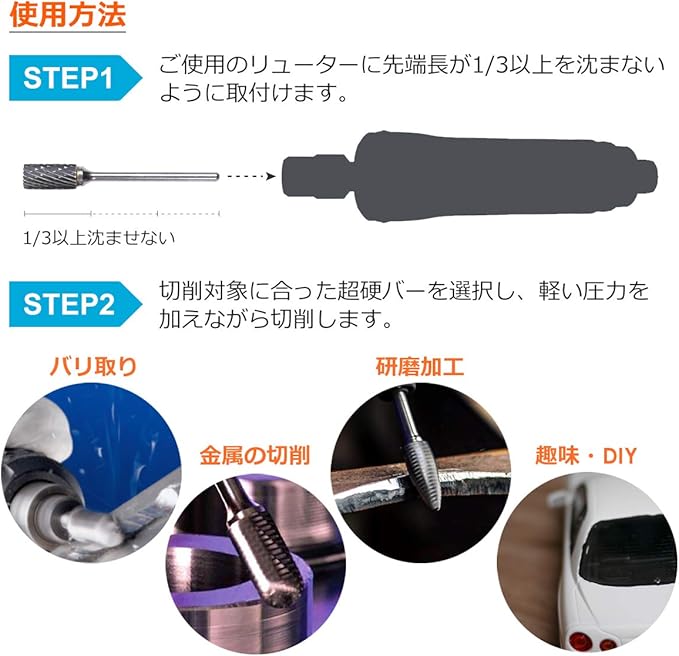 リュータービットは、金属の切削、バリ取りなど金属加工に使うものです。 専用のハンドグラインダー(エアーグラインダー)に取り付ける先端工具です。 高硬度・高強度の超硬合金を素材とすることにより、長寿命、高速生産を実現。 お客様のコスト削減や生産量増加に貢献します。 超硬ドリルのカット寿命(切断可能枚数)はスチール製カッターのおよそ2倍~10倍です。 また、刃先が摩耗して切断できなくなっても、刃先を研ぎ直す(再研磨)することで、新品同様の切れ味に戻ります。 1年以上使用する場合はスチール製カッターよりもトータルコストで有利です。 また、使われる際には保護メガネや防塵マスク、防護手袋、防音保護具(耳栓)など適切な保護具を着用してください。