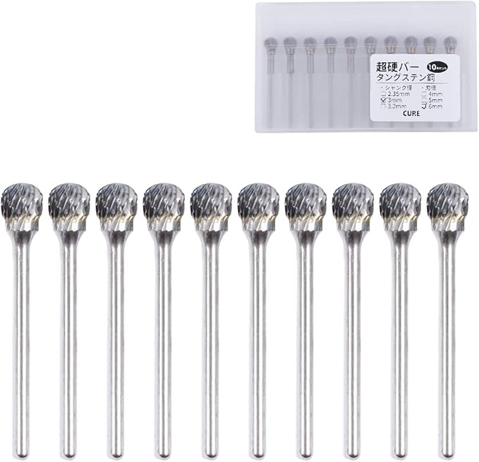 CURE(キュア) リュータービット 超硬バー ルータービット 超硬ドリル 研磨 タングステンバー タングステン加工 ロータリーバー 球型 10本セット 専用プラケース入り シャンク径 3mm ヘッド径 6mm | KAZESHOP