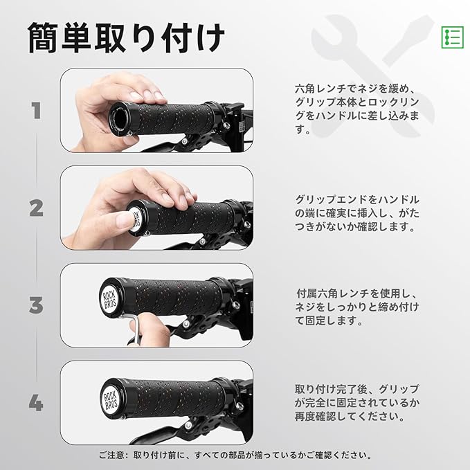 【アルミロックでしっかり固定】片側にアルミ合金製ロックリングと緩み防止(耐落)加工のナットを採用。ハンドルにしっかりと固定され、ズレや脱落の心配が大幅に軽減されます。付属の六角レンチで工具一本で簡単に取り付け可能。エンドキャップ付きで見た目もすっきりです。